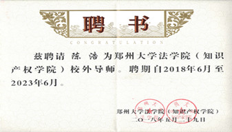 2018年5月公司陳浩總經理被鄭州大學法學院(知識產權學院)聘為校外導師。