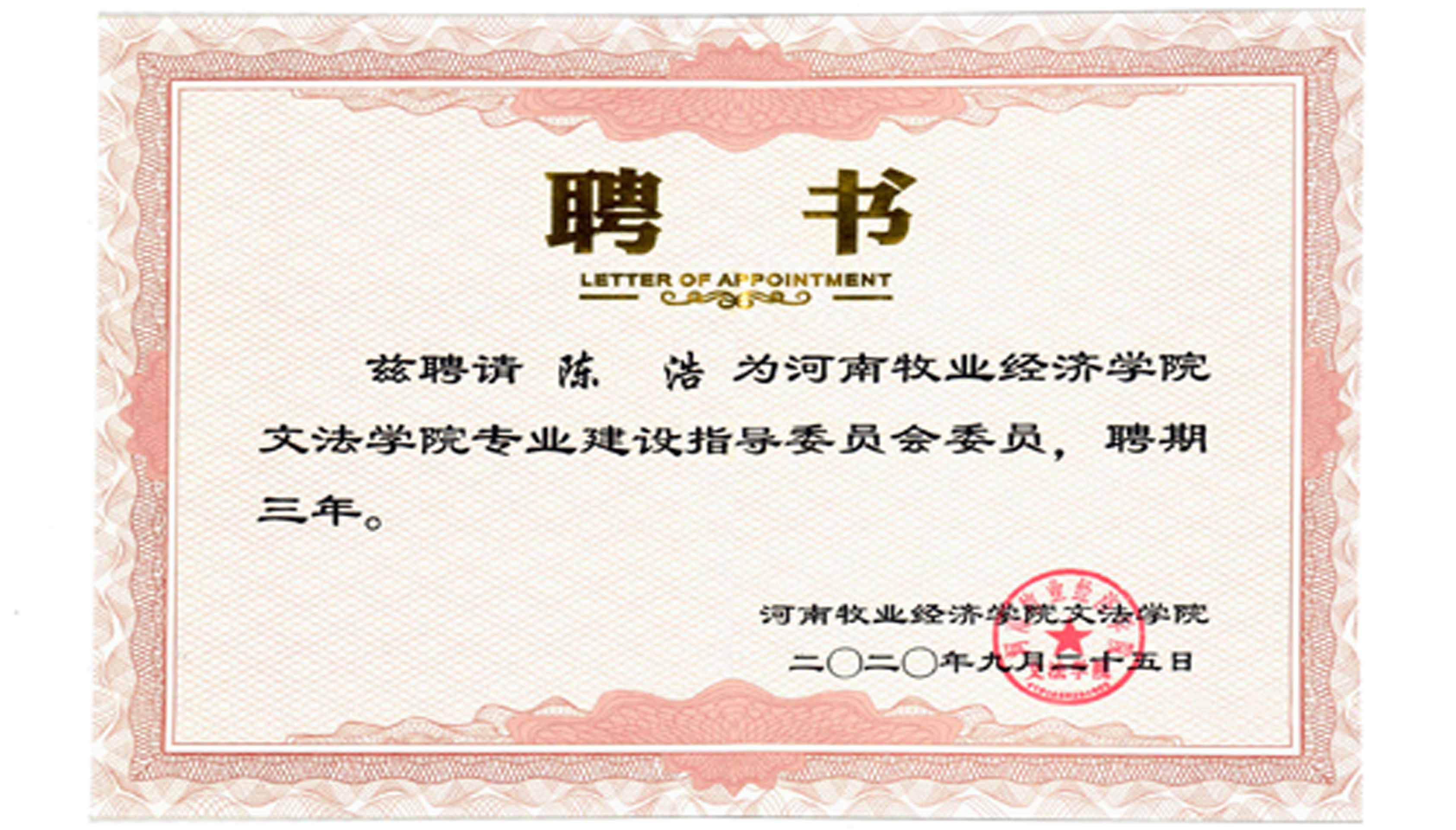 2020年9月公司總經理陳浩被河南牧業經濟學院(文法學院)聘為專業建設指導委員會會員。