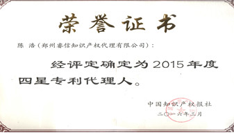 2016年3月公司陳浩總經理被評為“2016年度四星專利代理人”。