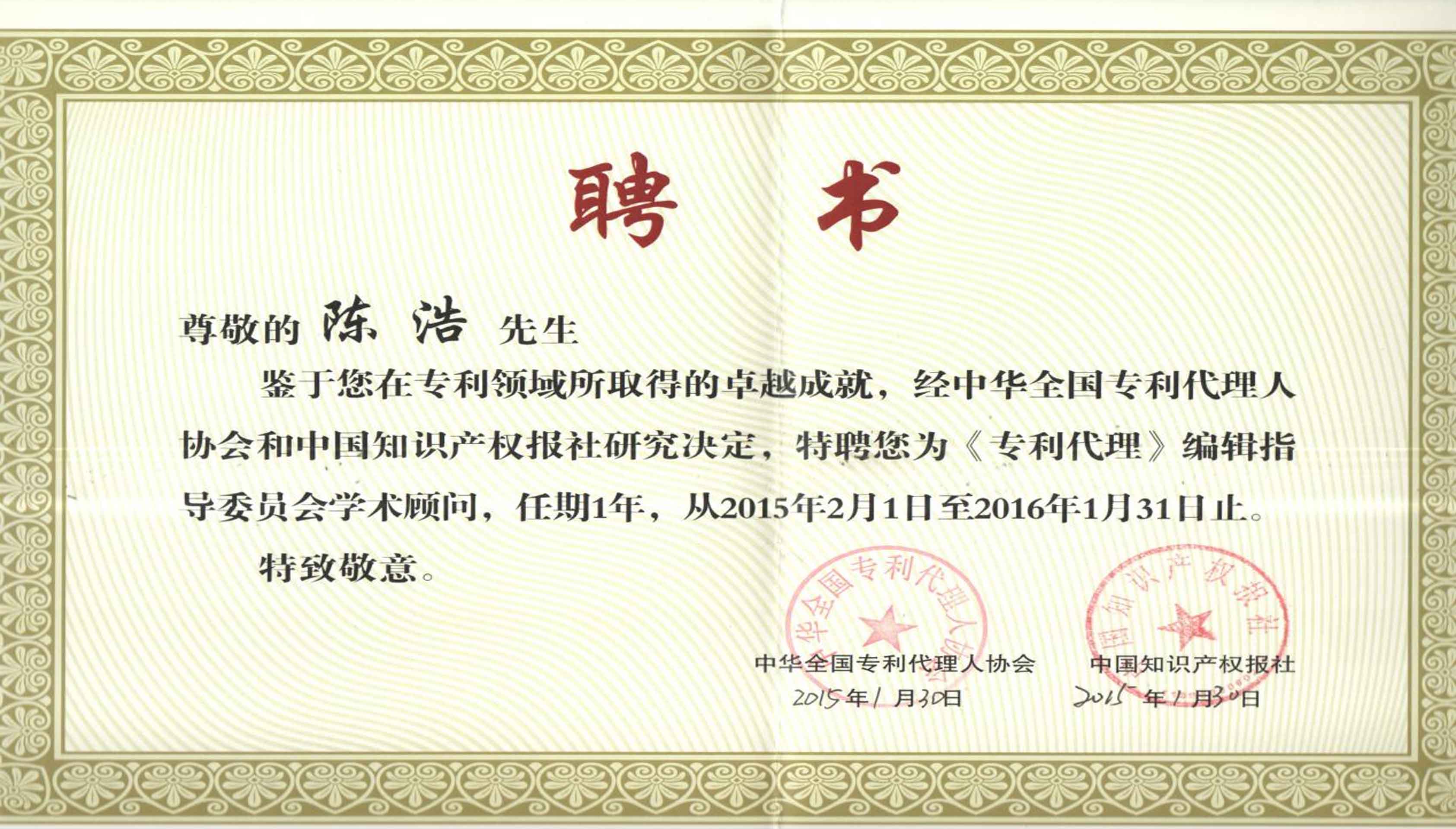 2015年1月公司總經理陳浩受聘擔任《專利代理》雜志學術顧問。