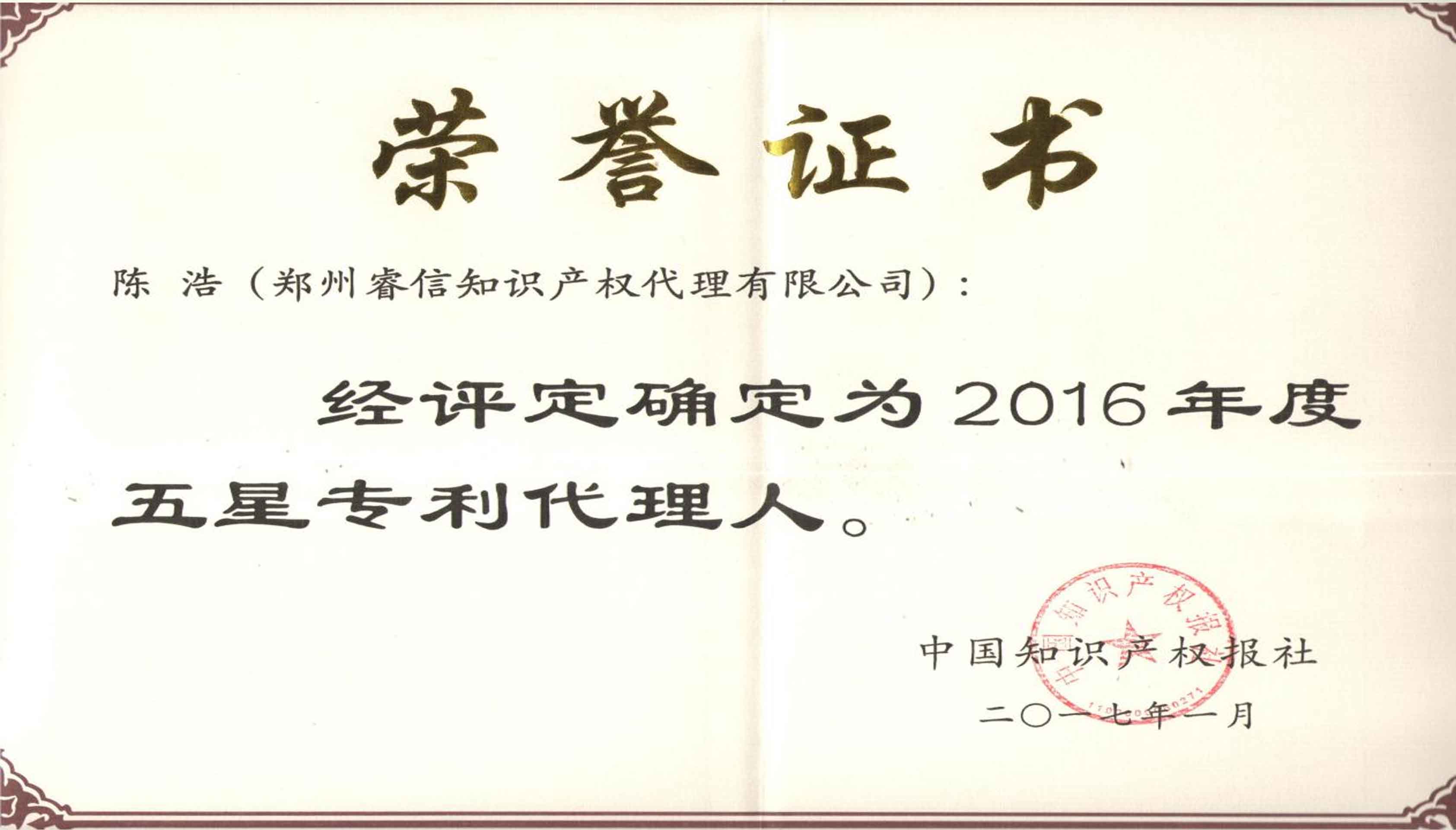 2017年1月公司陳浩總經理被評為“2016年度五星專利代理人”。