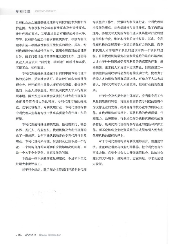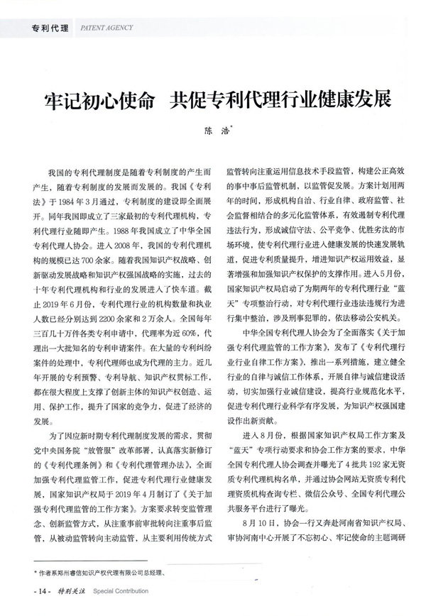 陳浩——鄭州睿信知識產權代理有限公司總經理,是中華全國專利代理人協會第九屆副會長,現任中華全國專利代理人協會第十屆副會長。陳總是全國知識產權行業領軍人才,國家知識產權專家庫專家,全國五星級專利代理人,工業和信息化領域知識產權專家,從事專利代理24年,見證了代理行業的發展和變遷。陳總用獨特的視角,通過對不同時期我國專利代理制度的介紹,談專利代理行業的初心和使命。專利代理行業的特殊性在于其社會責任性,專利代理之于創新主體、之于政府和管理部門都有著重要的作用。如何正確認識和定位專利代理行業及職業,專利代理何去何從已經不是一個行業、一個機構自身的問題和自身能夠解決的問題,而是一個關乎企業競爭、國家發展的問題。陳總并就專利代理行業發展面臨的問題提出了頗有見地的解決辦法。
