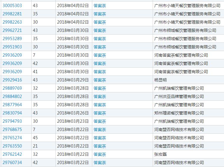 (“答案茶”商標在2018年1月至4月盲查期內大約被不同的申請人申請90余次)