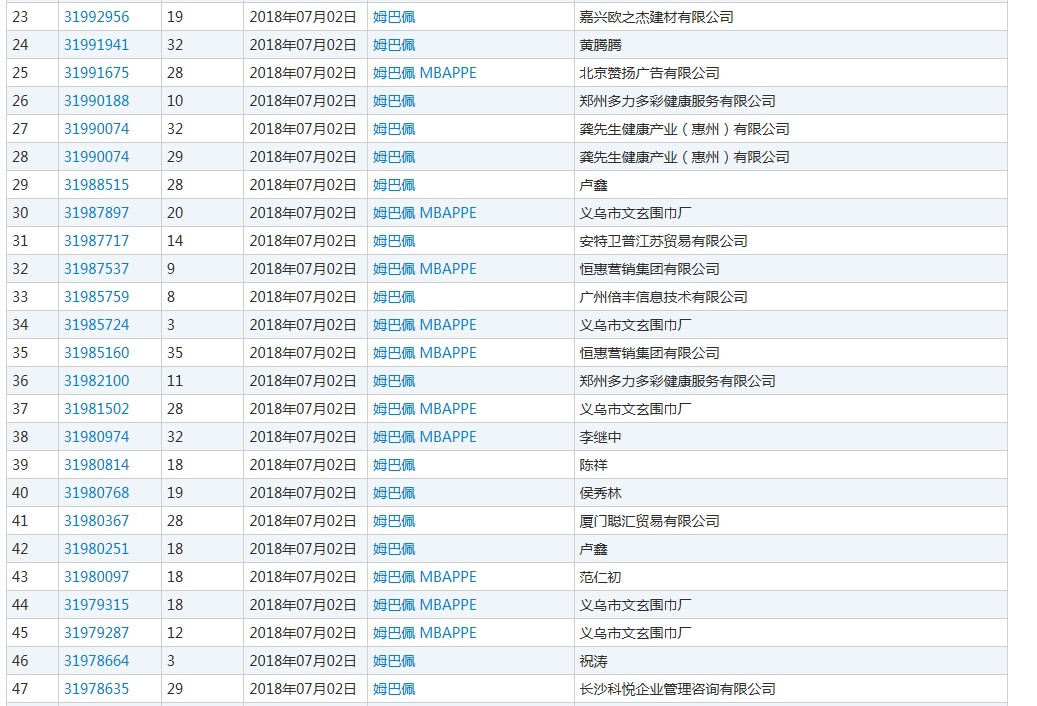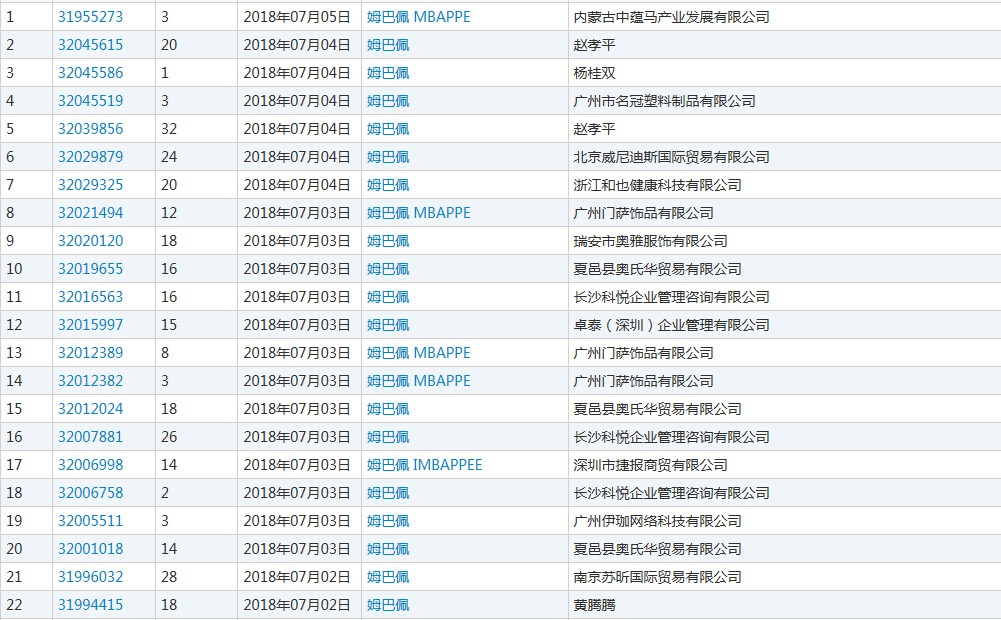 在本屆世界杯開賽后,隨著姆巴佩的天賦與才華開始綻放,申請“姆巴佩”這一商標的人數又迎來了井噴式的增長,短短數日,就有八十多個關于“姆巴佩”的新申請。
