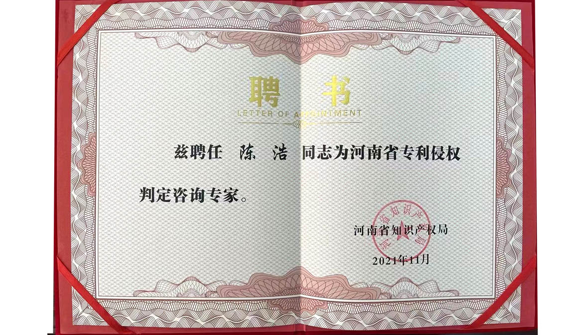 2021年11月公司總經理陳浩被河南省知識產權局聘為河南省專利侵權判定咨詢專家。