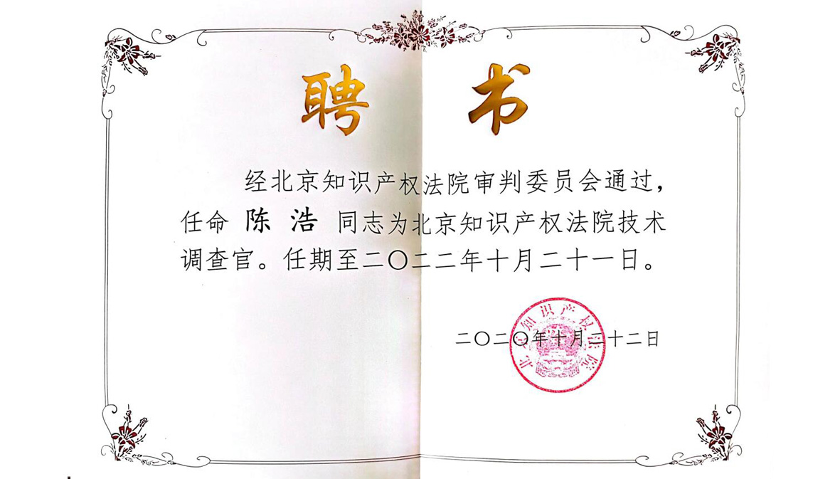 2020年10月北京知識產權法院審判委員會任命公司總經理陳浩為北京知識產權法院技術調查官。