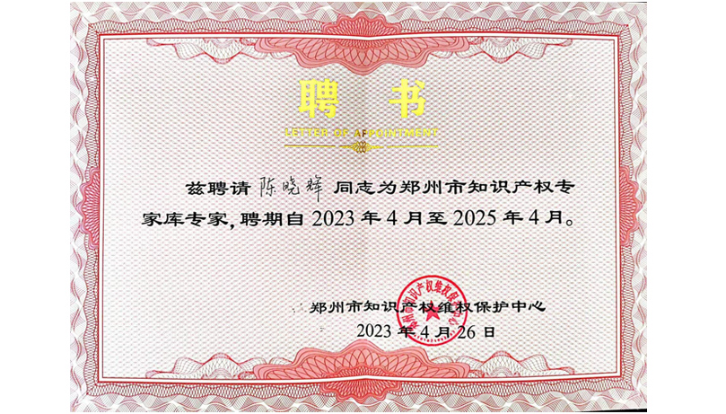 2023年4月鄭州睿信副總經理陳曉輝首聘為鄭州市知識產權專家庫專家。