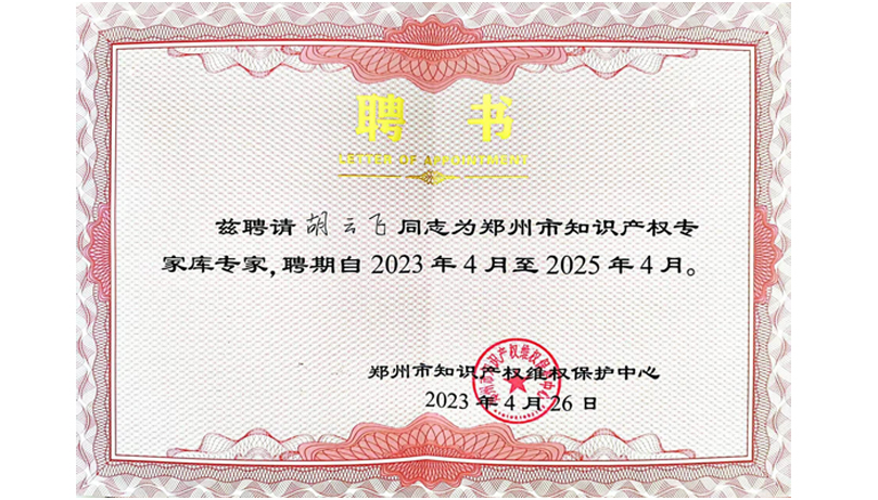 2023年4月鄭州睿信副總經理胡云飛首聘為鄭州市知識產權專家庫專家。
