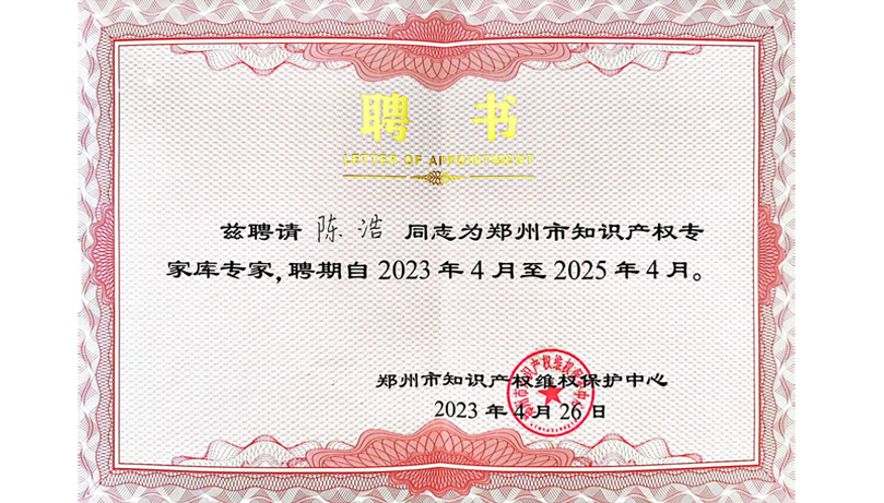 2023年4月鄭州睿信總經理陳浩首聘為鄭州市知識產權專家庫專家。